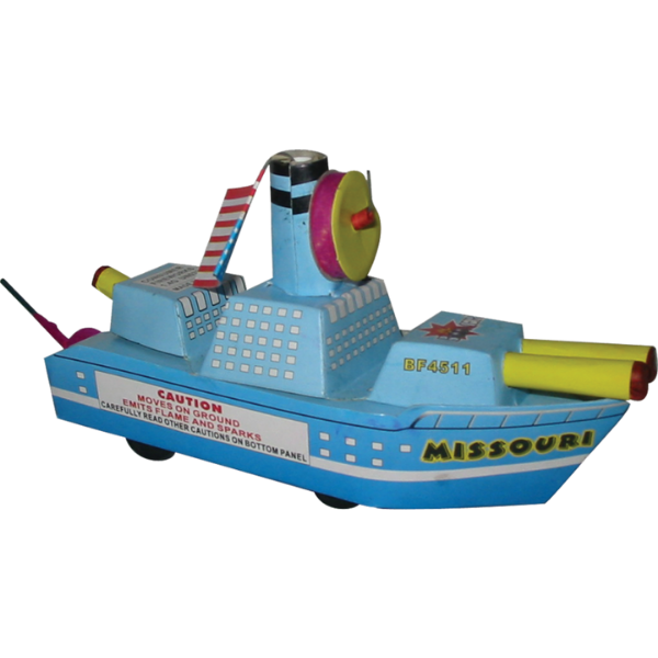 The boat moves forward and backward before shooting off its forward and rear guns and raising the stars and stripes amid a shower of multi colored sparks.